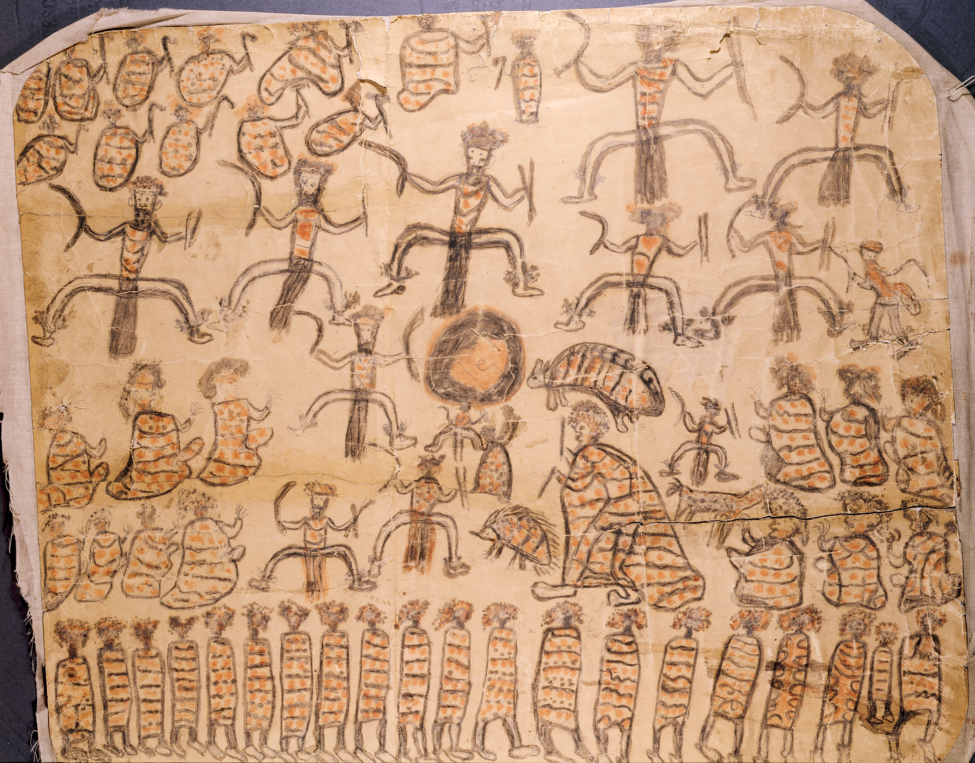 A painting by Indigenous artist William Barak. Depicts humans and small animals dancing.