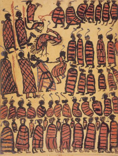 An Aboriginal ceremony, including a wallaby and an emu. The human figures are dressed in patterned cloaks.