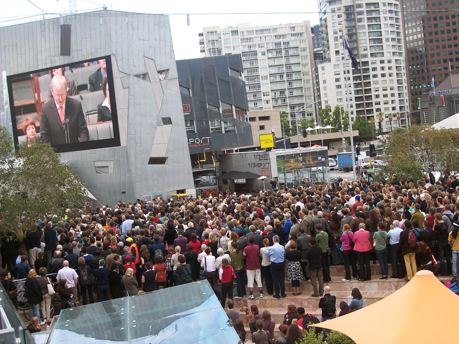 Kevin Rudd delivers his apology on Sorry Day, watched by a crowd on the screen at Federation Square, Melbourne.