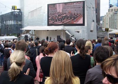 Crowds gathered to watch the proceedings on Sorry Day, Upper Federation Square, Melbourne.
