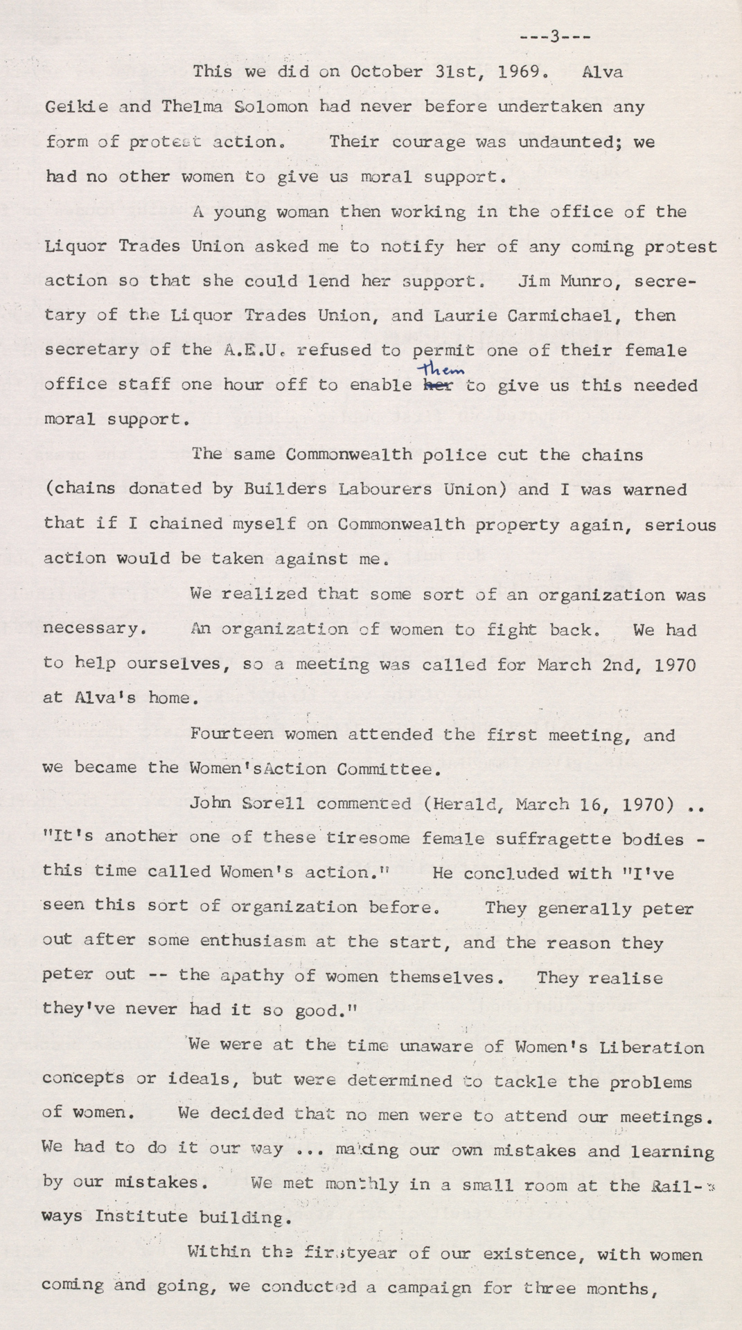 Zelda D'Aprano's personal account of her role in the struggle for equal pay. This manuscript is a part of her papers, which are held at SLV. They also includes correspondence and unpublished articles, scrapbook of press cuttings and miscellaneous published material on women's liberation.