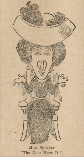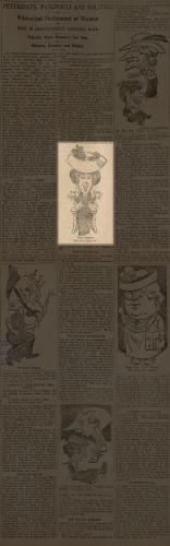 A satirical view of a suffragette meeting, with caricatures of attendees.