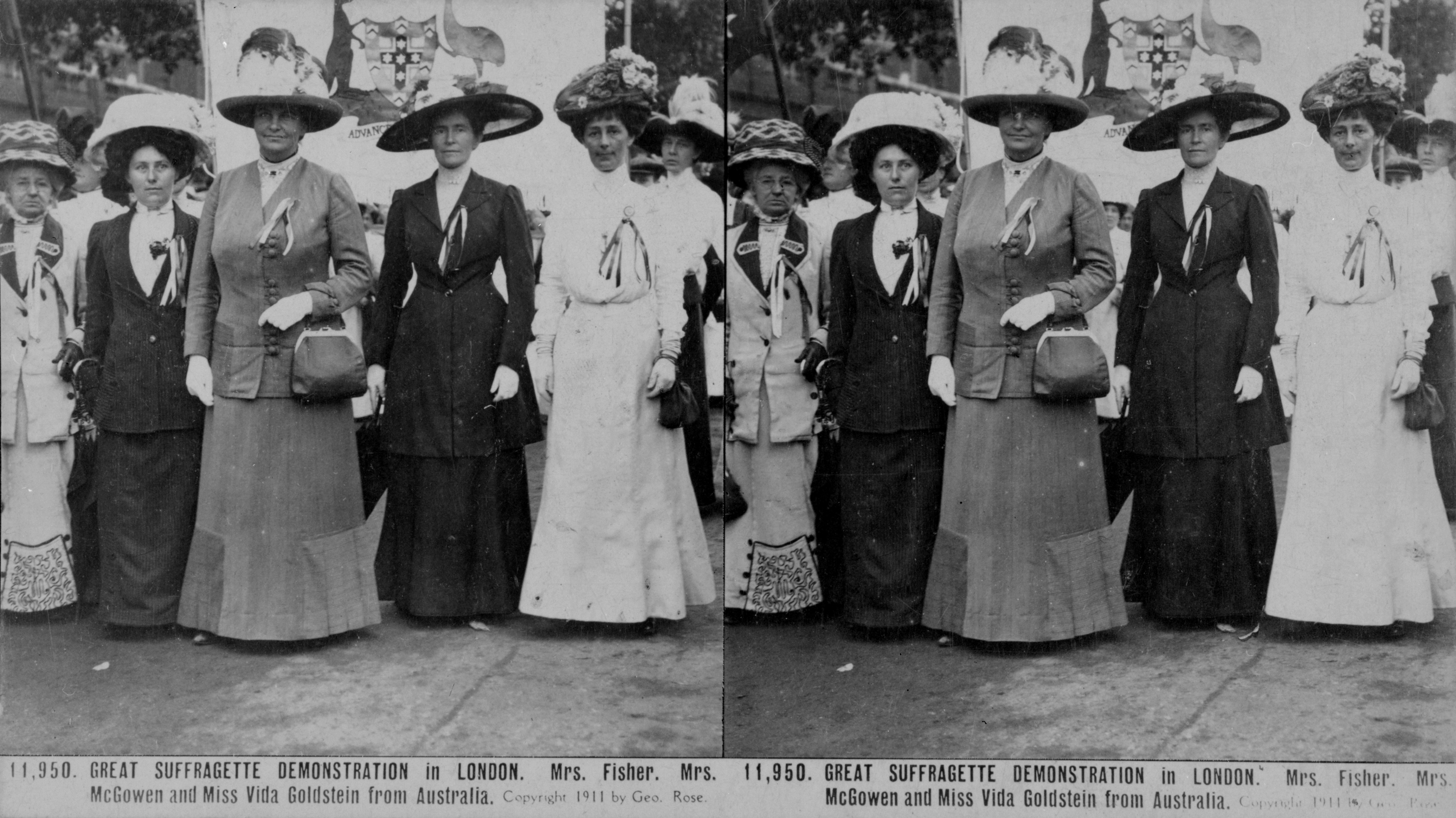 Several Australian women, including Vida Goldstein, attending a sufragette demonstration in London.