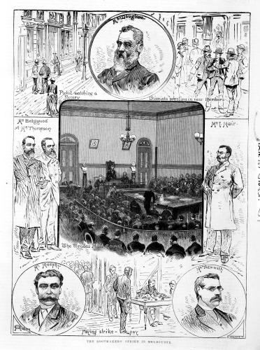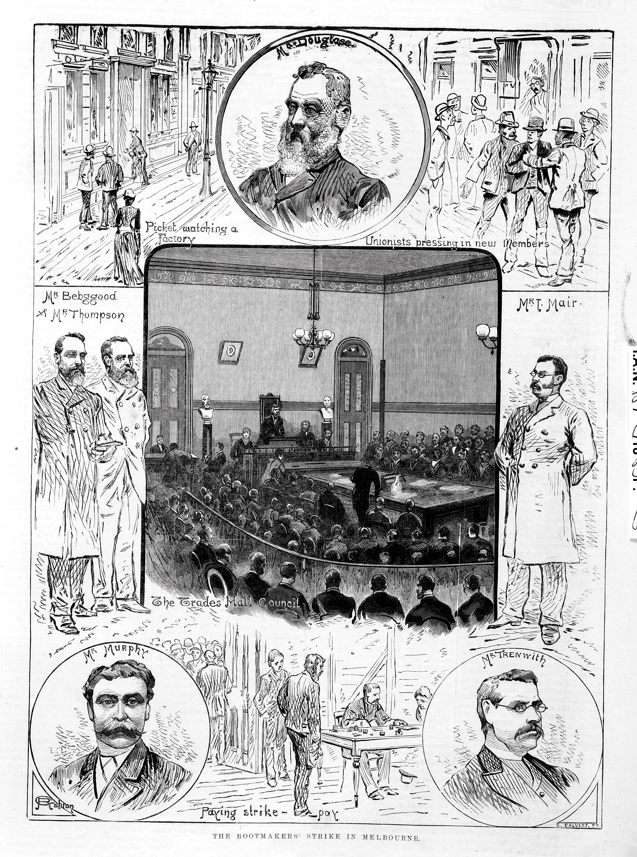 Various scenes from the bootmakers' strike, including 'Unionists pressing new members' and 'Paying strike pay'.