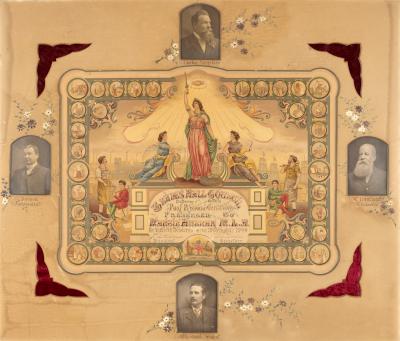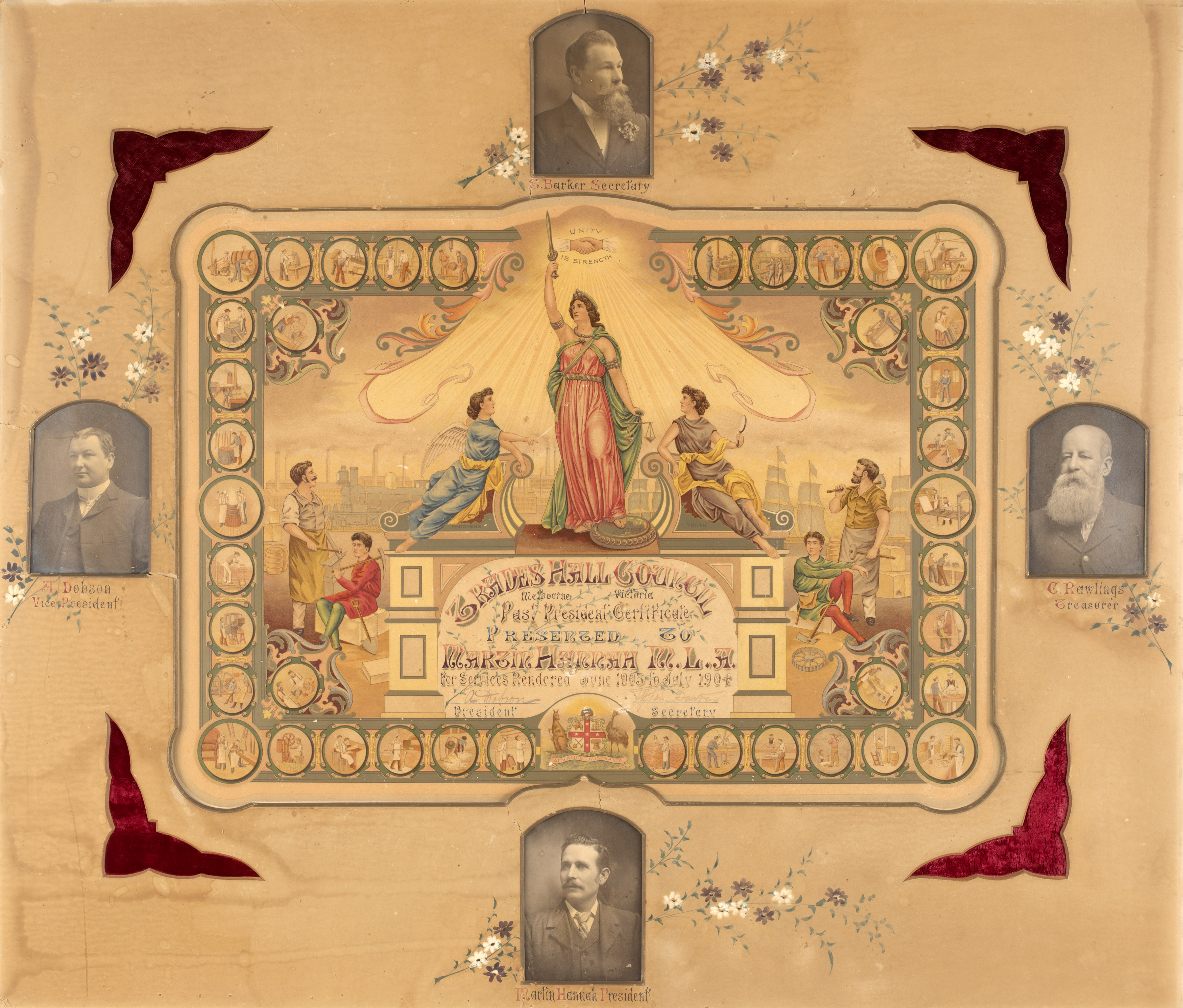 Ornately decorated certificate presented to Martin Hannah upon ending his time as Trades Hall Council president.