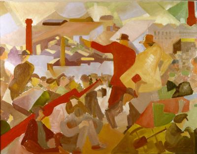 This Modernist style painting shows a trade union meeting on the banks of the Yarra River, with a crowd of people listening to union official Fred Riley give a speech. Christian Jollie Smith stands beside him.