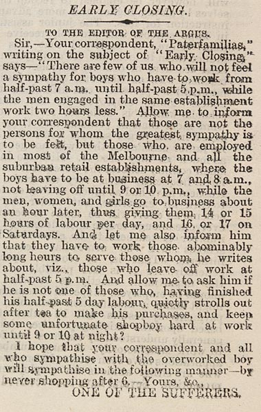 Letter to the editor commenting on the irony of those who have won earlier hours then shopping in the evening.