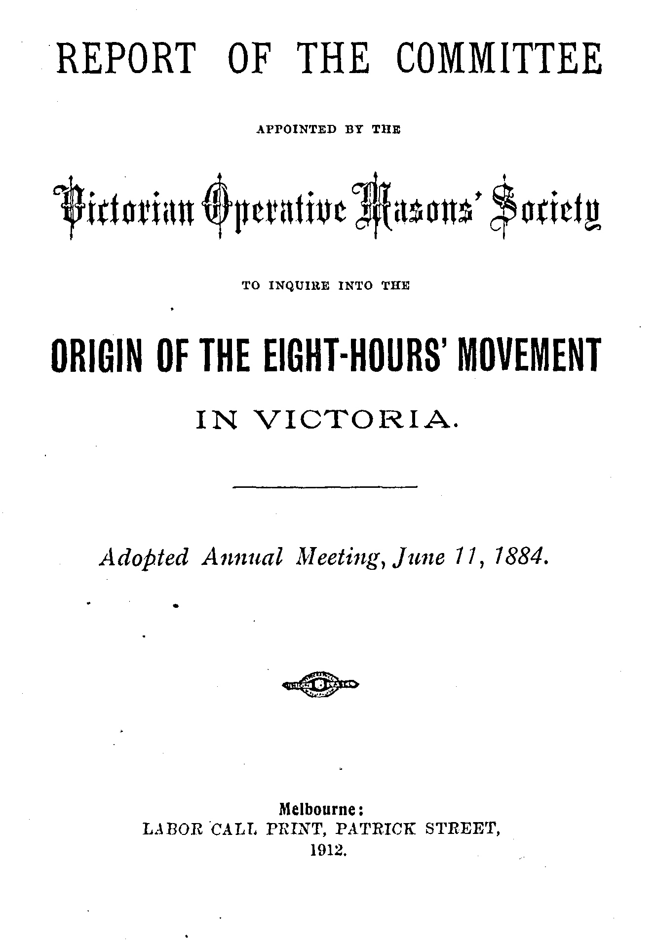 Cover of the final report of the committee formed by the Victorian Operative Mason's Society to determine who introduced the concept of the 8-hour day to Victoria.