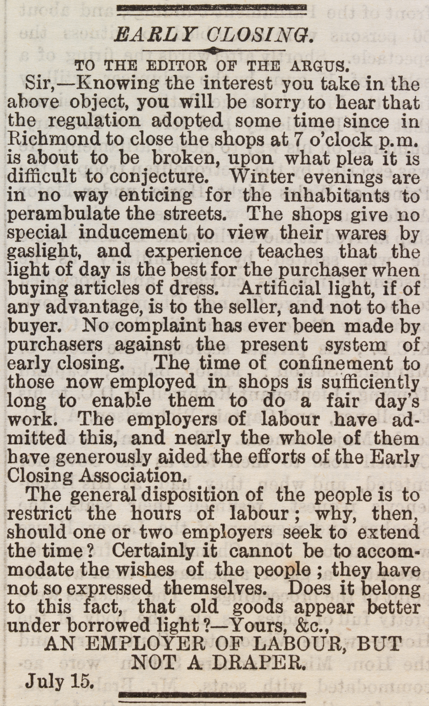 Letter to the editor claiming that evening shopping is good for the sellers, but not the buyers.