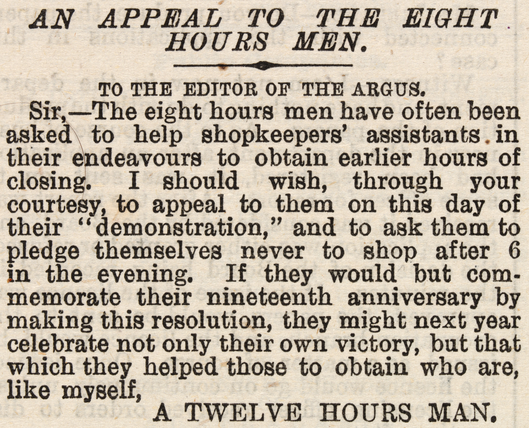 Letter to the editor from a shop assistant, asking labourers who had already won an eight hour day to give real support by not shopping past the time of the standard work day.