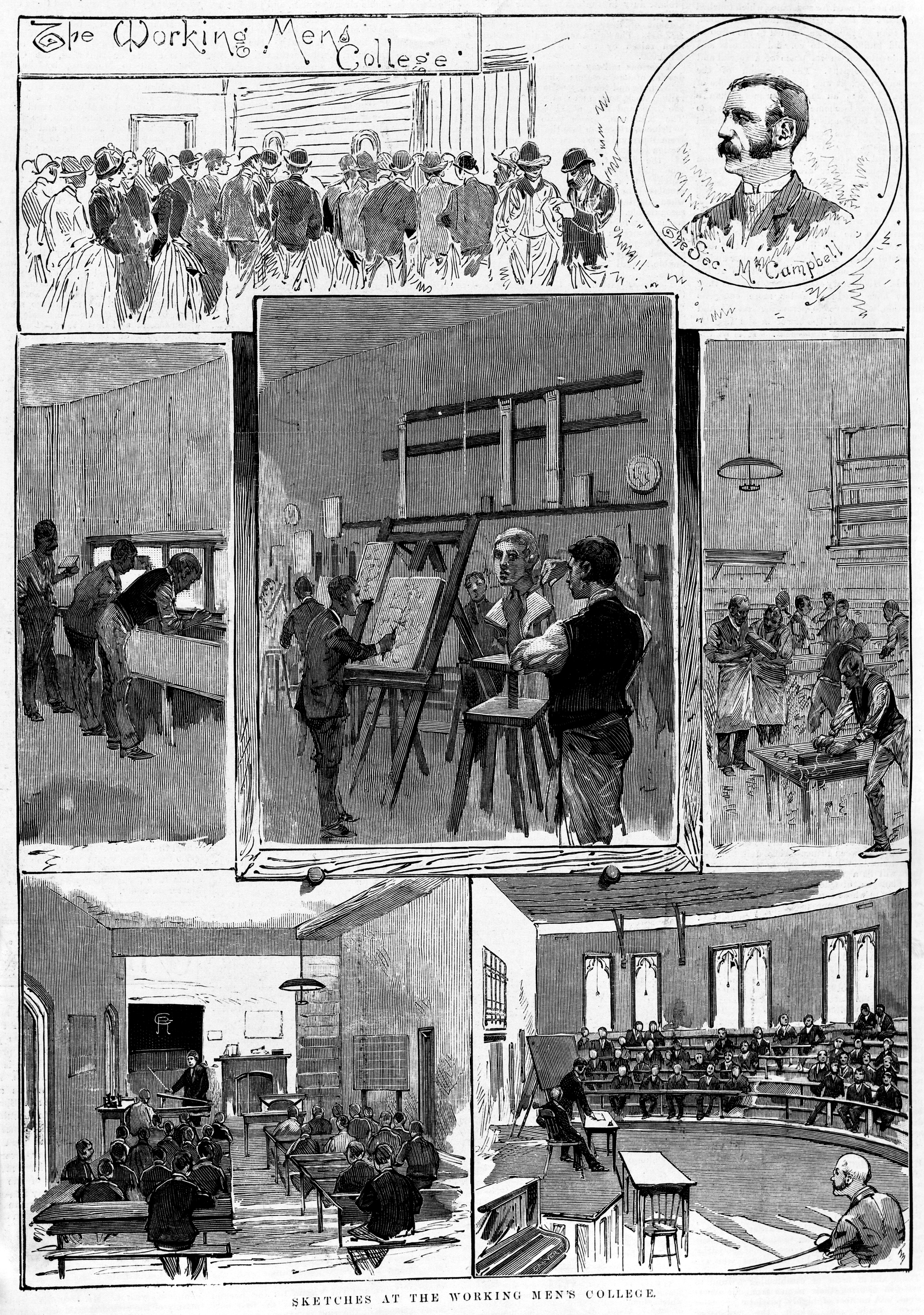 Classrooms at the Working Men's College, in which students are sketching. The man at top right is Frederick Alexander Campbell, friend of Francis Ormond and and long-time director of the College.