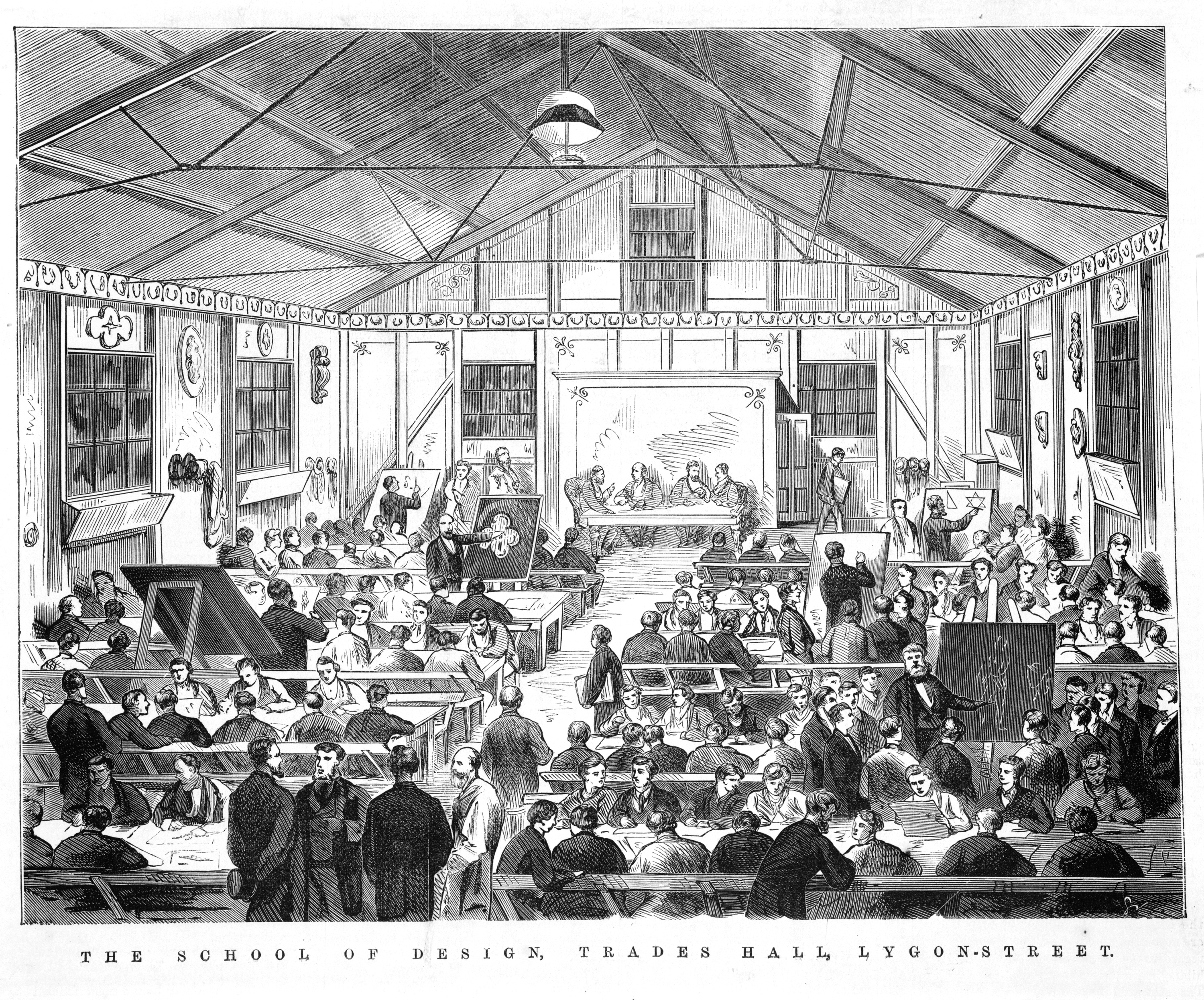 Teachers demonstrating various aspects of drawing to students at the Trades Hall on Lygon Street.