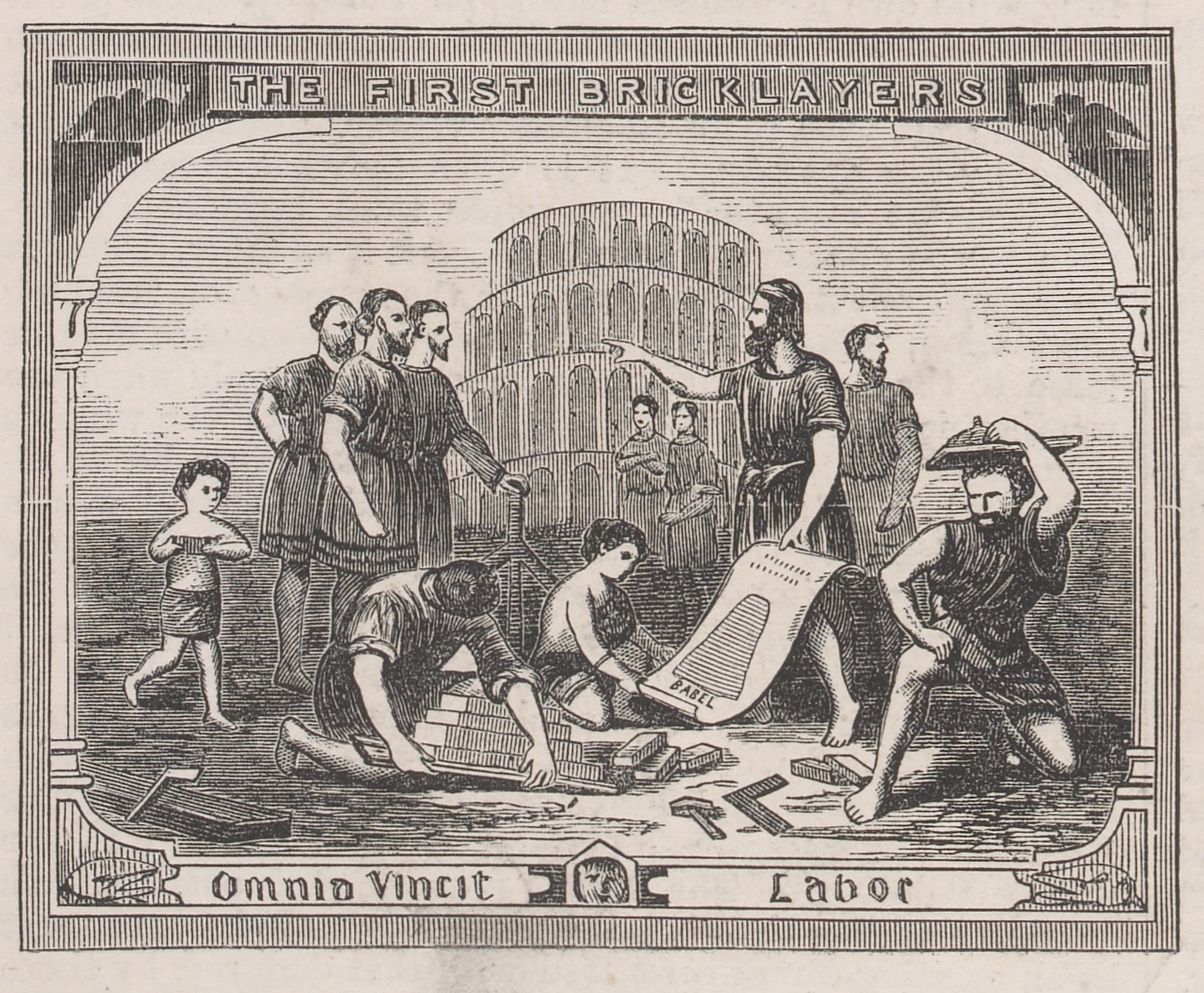 In this image bricklayers create a sense of nobility around their trade by comparing it to the grand traditions of building and architecture, in this case looking back to the Biblical story of the Tower of Babel. By making these links in people's minds, they hoped to improve public opinion of the working classes.