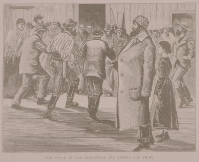 When the dance was taking place, Carrington hadn't yet arrived in Glenrowan. However, he drew this image a week after the siege, which gave him time to speak to police and get the most factual account of events. Ned is depicted wearing the cloth cap that protected his head from the weight of his helmet, and with his coat over his shoulders, in light of Carrington's discovery that this was how Ned wore his coat.
