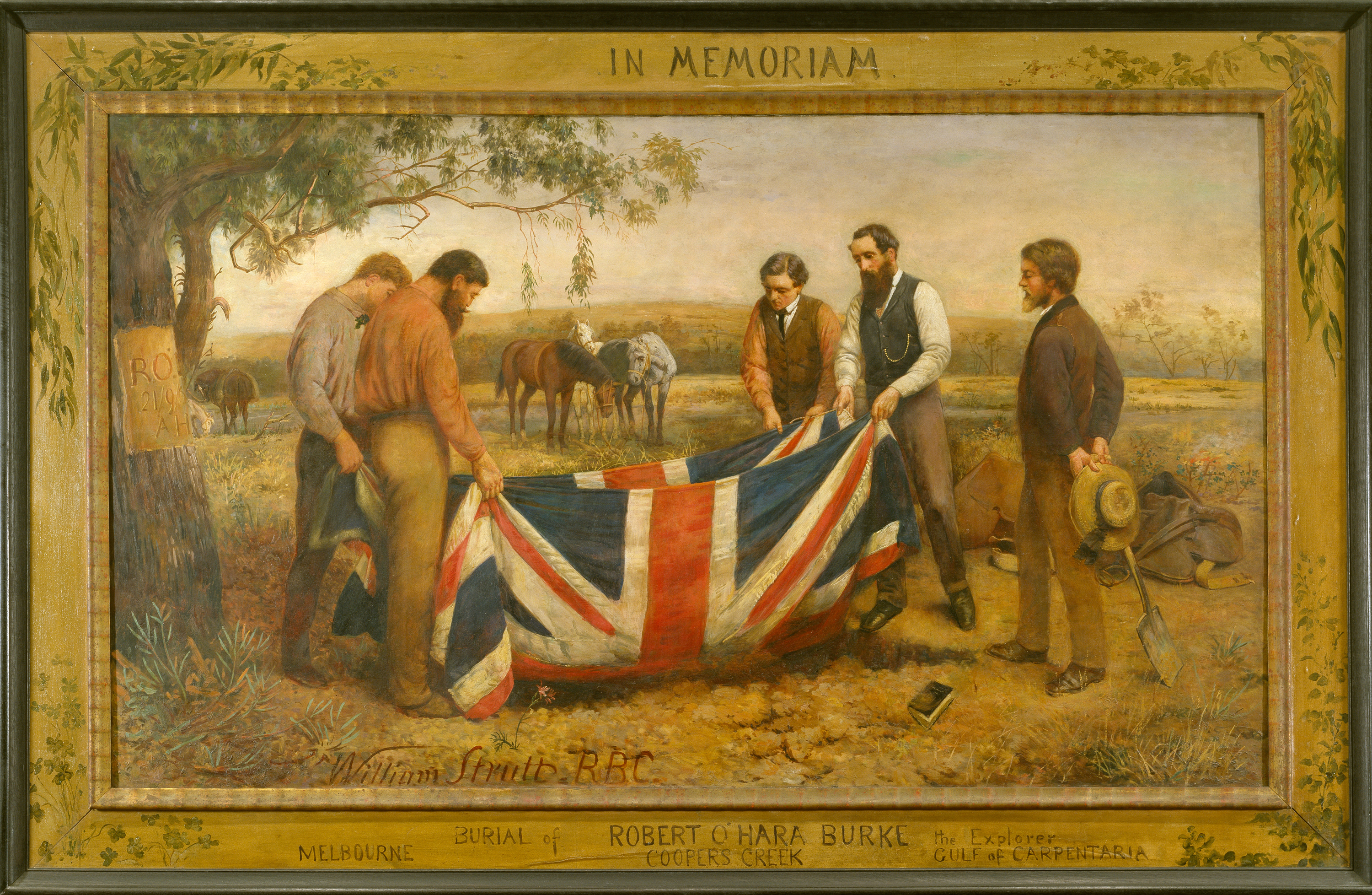 The members of Alfred Howitt's relief party burying the remains Robert O'Hara Burke. Strutt prepared this painting over the course of several years, interviewing people who were at the scene, and completing many preliminary sketches.