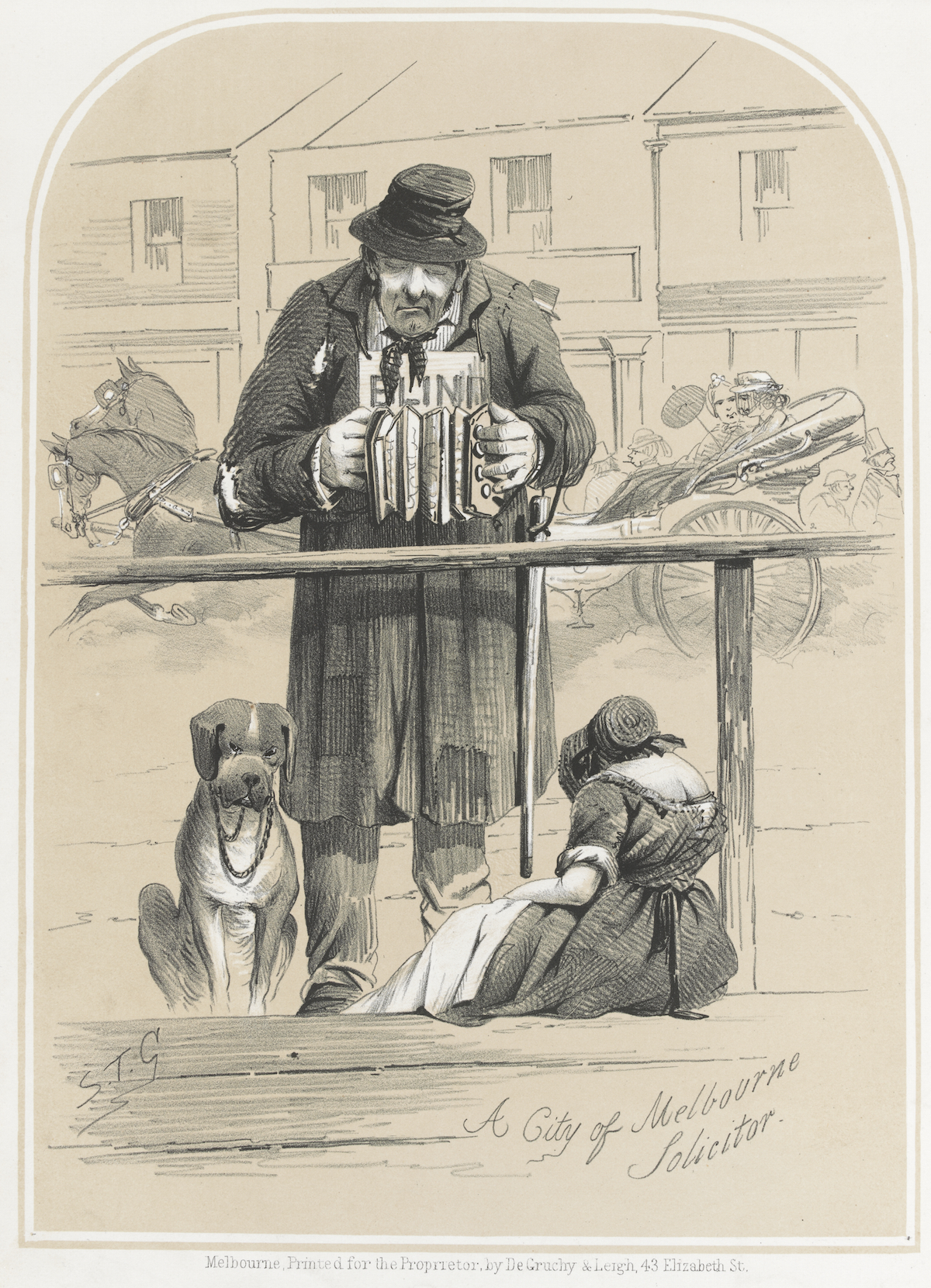 This lithograph, like many of his works, depicts the plight of the unlucky during the goldrush. Here he shows a blind beggar playing a small accordion. He wears a tattered coat and the notice around his neck.