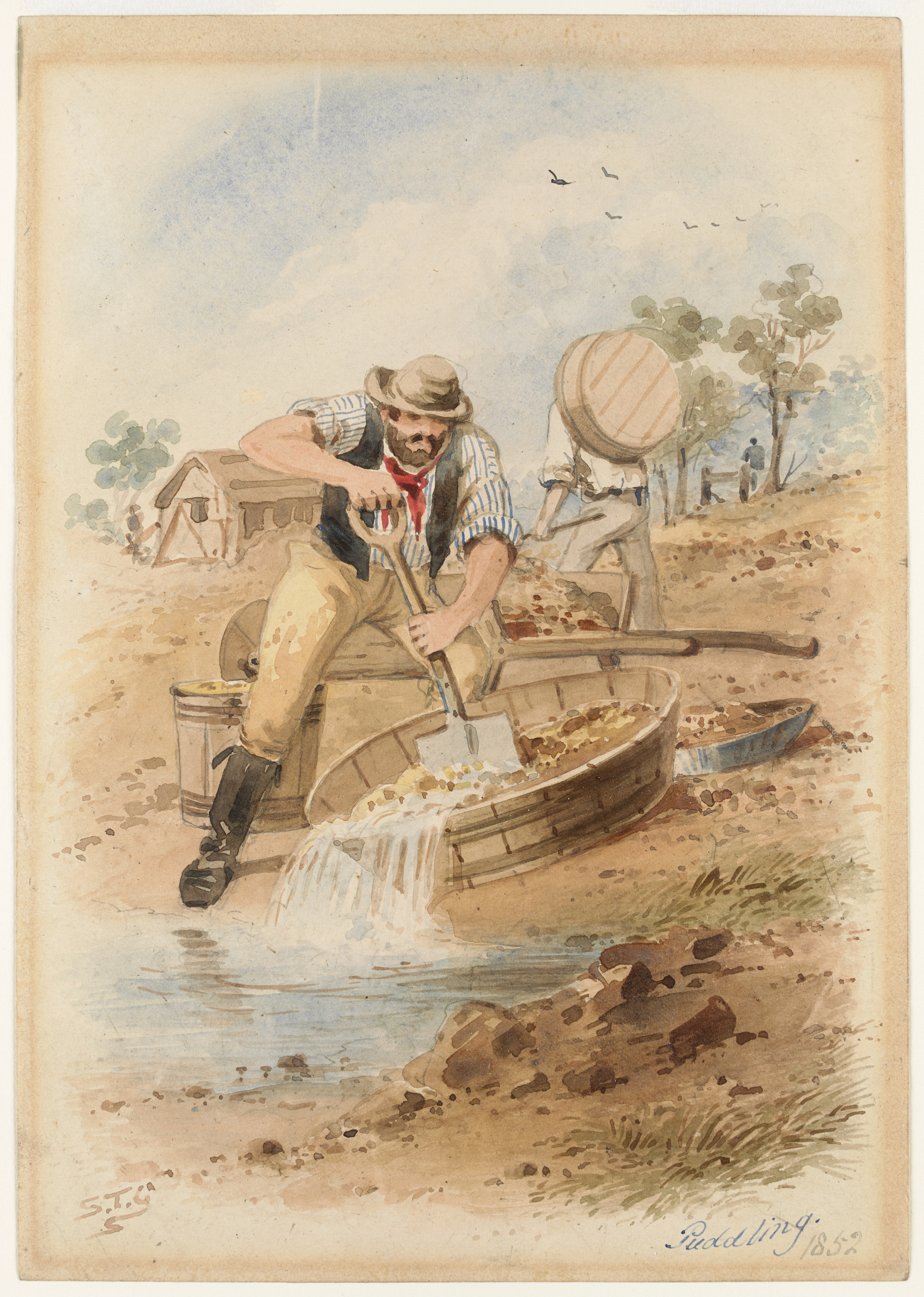 This painting depicts the process of puddling in which beer barrels were cut in half and used to wash the dirt excavated by miners. A constant supply of water was needed to get the best results.