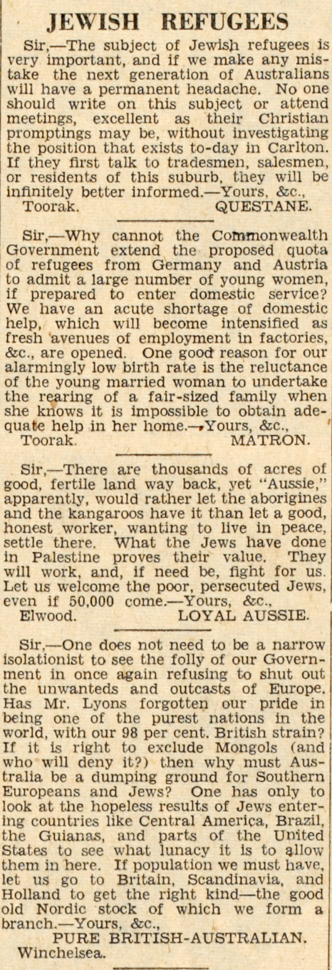 News item: Jewish refugees (letters to editor)