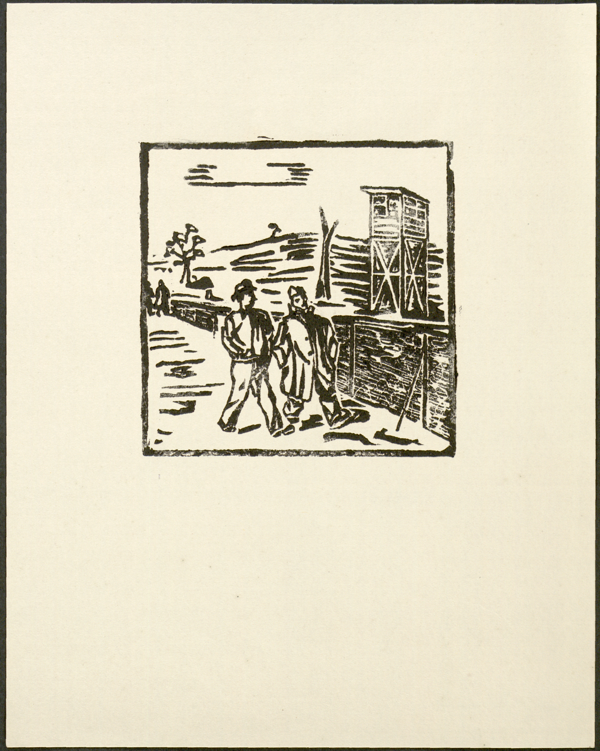 This is one of a set of prints - linocuts or perhaps woodcuts - produced by an unidentified artist in the Tatura camp. The artist also produced a printed folio to house the prints, and titled the set 'Lager skizzen', which means 'camp sketches'.