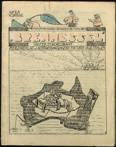 Some of the German prisoners of war interned in Tatura remained loyal to the Nazi regime, and they secretly published this magazine for their own use. The title "Brennessel" is the German name for nettle, a plant which stings if touched. The sting of the nettle is meant to refer to the 'sting' of the magazine's satirical humour. The term 'Hinter stacheldraht' means 'behind barbed wire'. 'Eigenverlag' means 'self-published', and 'internierungslager' means 'internment camp'. The illustration shows a prisoner waking to the New Year behind barbed wire as lazy Australian guards doze and fish.
