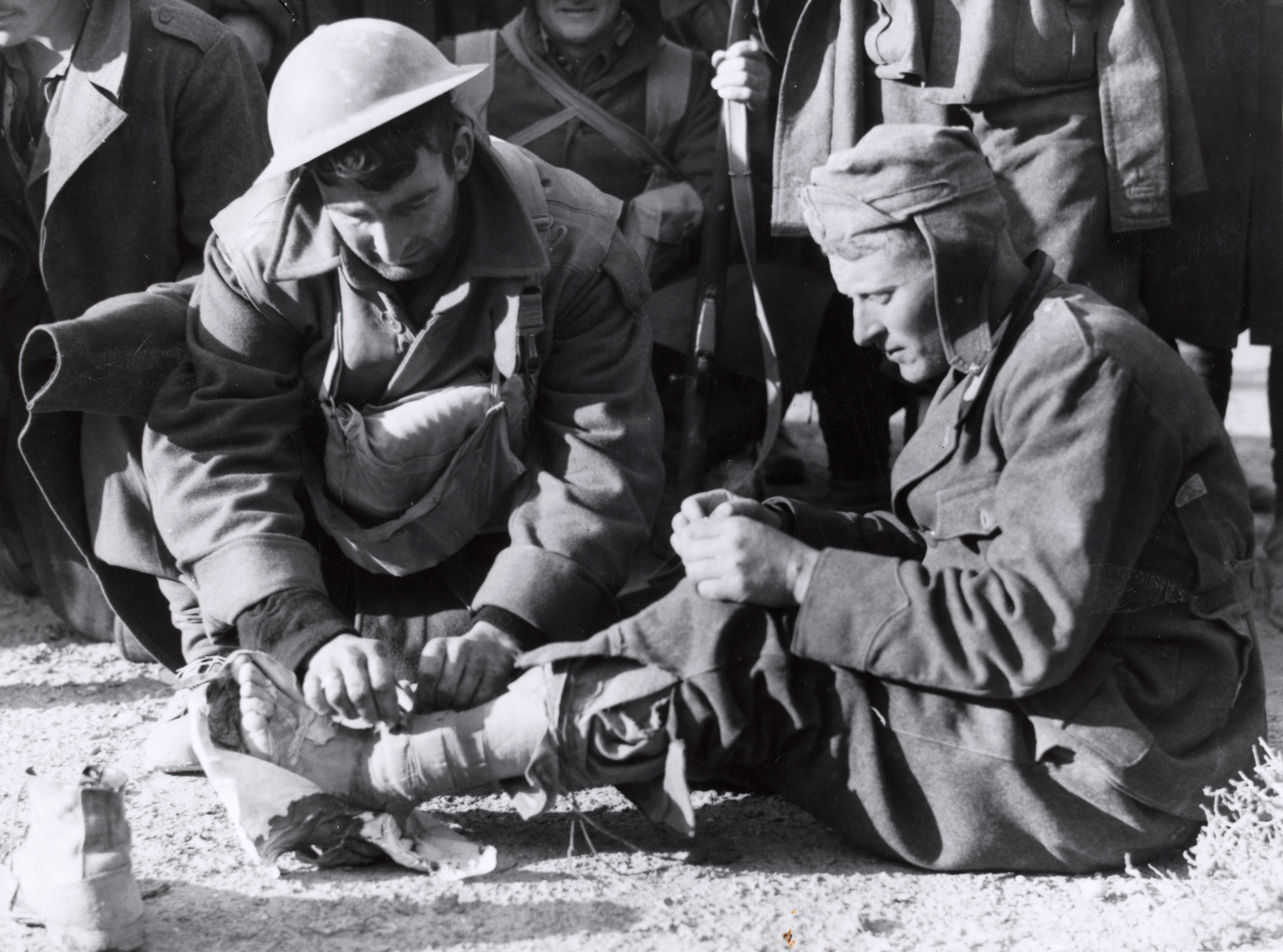 Once the battle was won in the desert, German and Italian troops surrendered readily without further resistance. This is one of many photographs taken of Allied troops aiding the captured soldiers who, perhaps only a day before, had been trying to kill them.