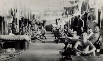This shows the crowded but still relatively spacious quarters in Changi prison, in Singapore. From here, war prisoners were sent to work on the Japanese railway between Burma and Thailand, where conditions were far worse.