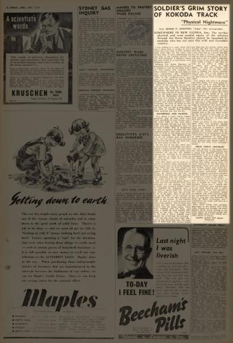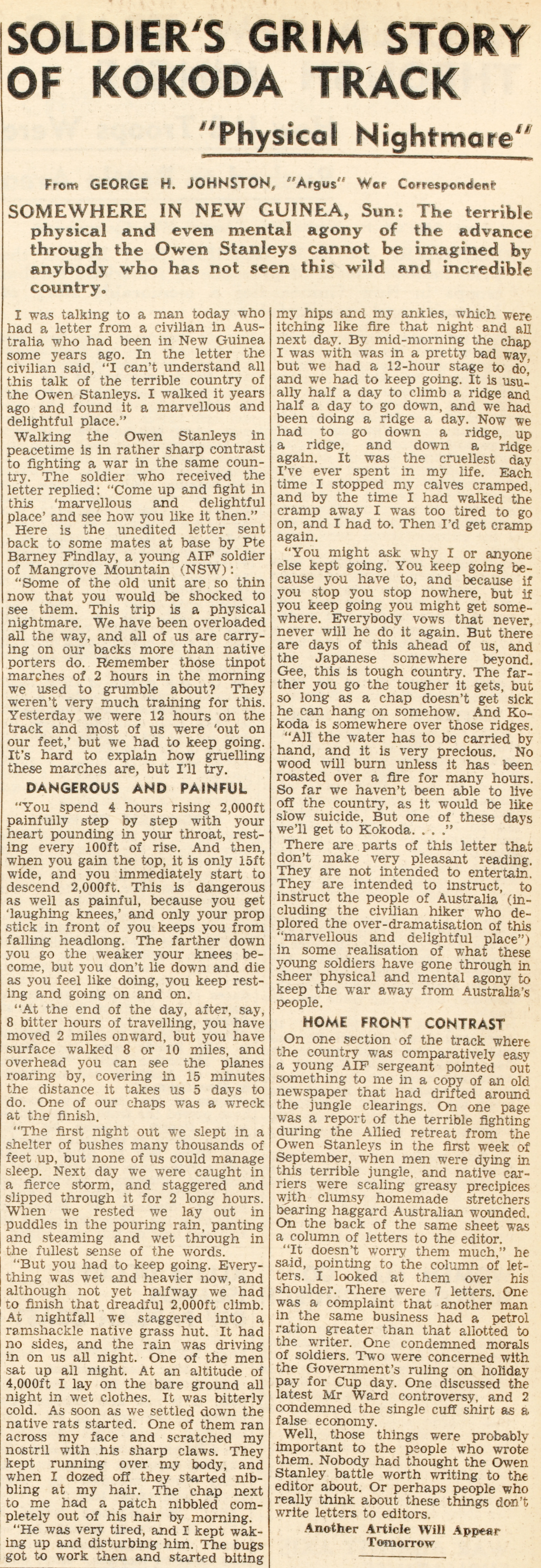 This article emphasizes the difficult fighting conditions of the Kokoda track. The exact location of troops was usually secret information, so this journalist heads his article from 'Somewhere in New Guinea', even though he is writing about the Kokoda Track.