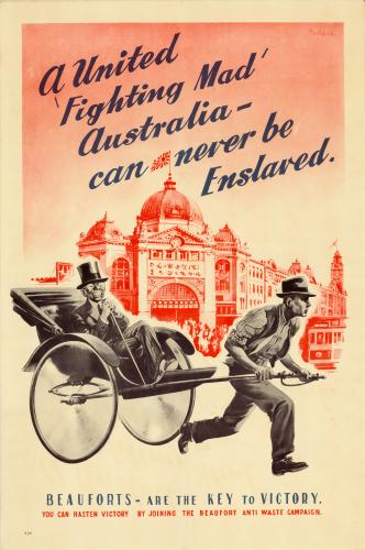 In World War 2, Australia was directly threatened by Japan, and Australian propaganda depicted an alarming prospect of life under Japanese rule.  This poster shows a typical Australian man pulling his new Japanese master in a rickshaw, past Flinders Street station which is decked out with Japanese signs and flags.  This particular poster campaign was intended to raise money for the building of the Beaufort Bomber, one of the few wartime airplanes manufactured in Australia.