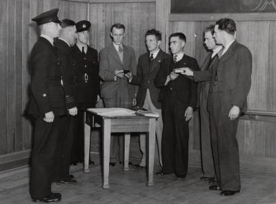 Young men being sworn in to the Royal Australian Air Force. Joining the armed forces was not just like getting a job. Men and women were required to swear an oath on the Bible that they would serve loyally. When there were not enough Bibles to go around, as in this picture, they had to share.