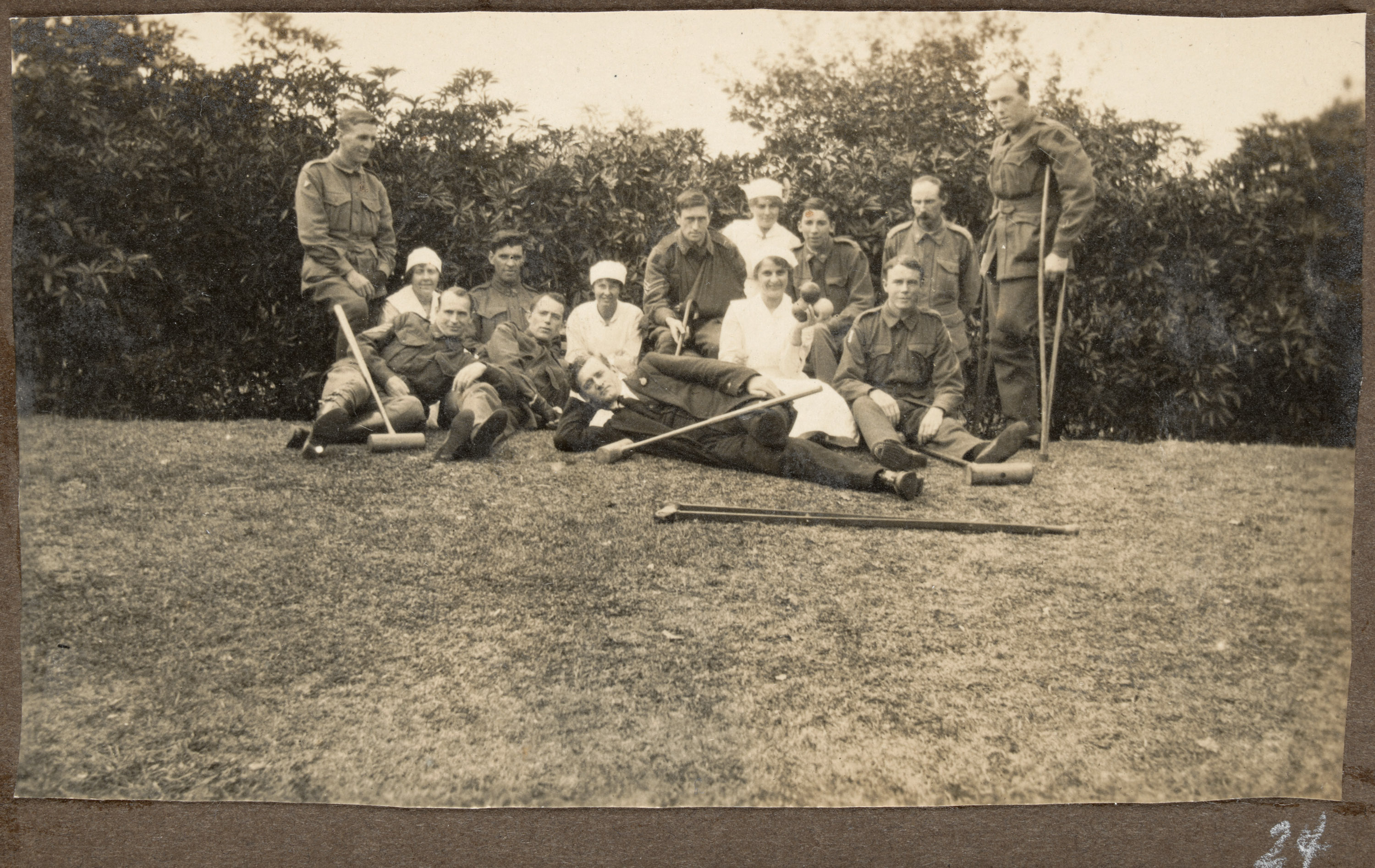 Many soldiers returning from the war had to recover from physical and psychological injuries, and spent time in repatriation hospitals like this. The man in the centre is unselfconscious about his missing leg, and is happy to prop his croquet mallet on the stump.