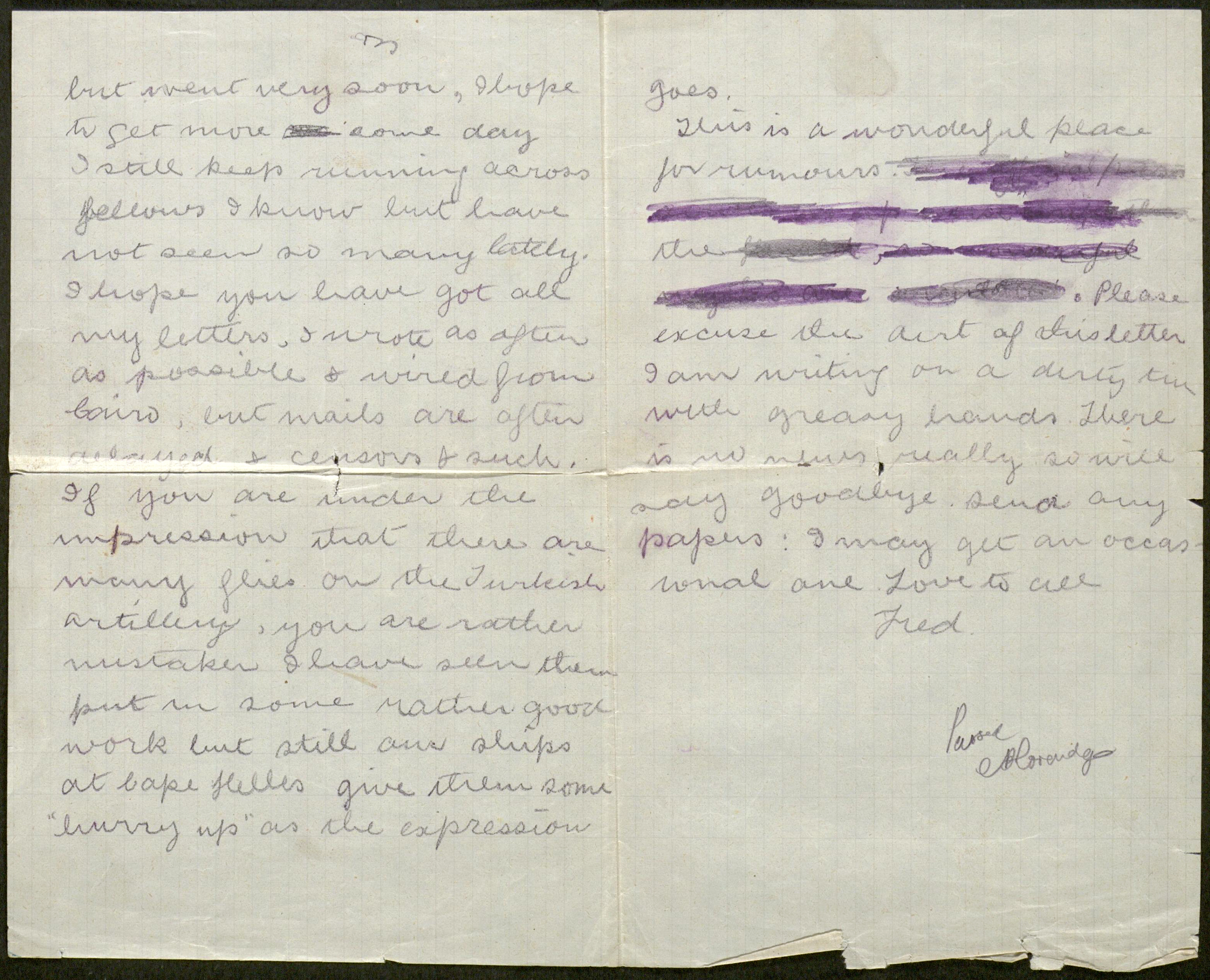 "...but went very soon, I hope to get more some day I still keep running across fellows I know but have not seen so many lately. I hope you have got all my letters, I wrote as often as possible and wired from Cairo, but mails are often delayed and censors and such. If you are under the impression that there are many flies on the Turkish artillery, you are rather mistaken. I have seen them put in some rather good work, but still our ships at Cape Helles give them some ’hurry up’ as the expression goes. This is a wonderful place for rumours