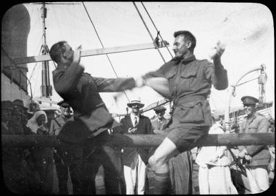 These soldiers are "jousting" with sacks or pillows on the deck of a troop transport. Their audience includes officers, crew, and a nurse.