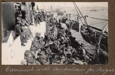 This photograph shows troops crowded aboard the transport ship Osmanieh, heading for Gallipoli in 1915. Two years later, this ship was sunk by German mines, with the loss of nearly 200 lives, including 8 nurses.