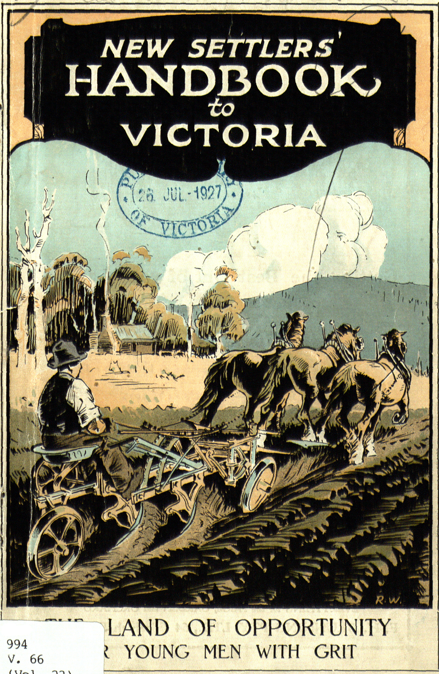 This 112 page pamphlet is an attempt, by the New Settlers' League, to communicate the important information that would be wanted by an immigrant who is contemplating an agricultural life in regional Victoria. It contains useful information such as the existence of concession fares on trains for those who can prove that they are taking up land direct from the Government, as well as how to rig up a bush shower from a kerosene tin, a jam tin and hog wire.