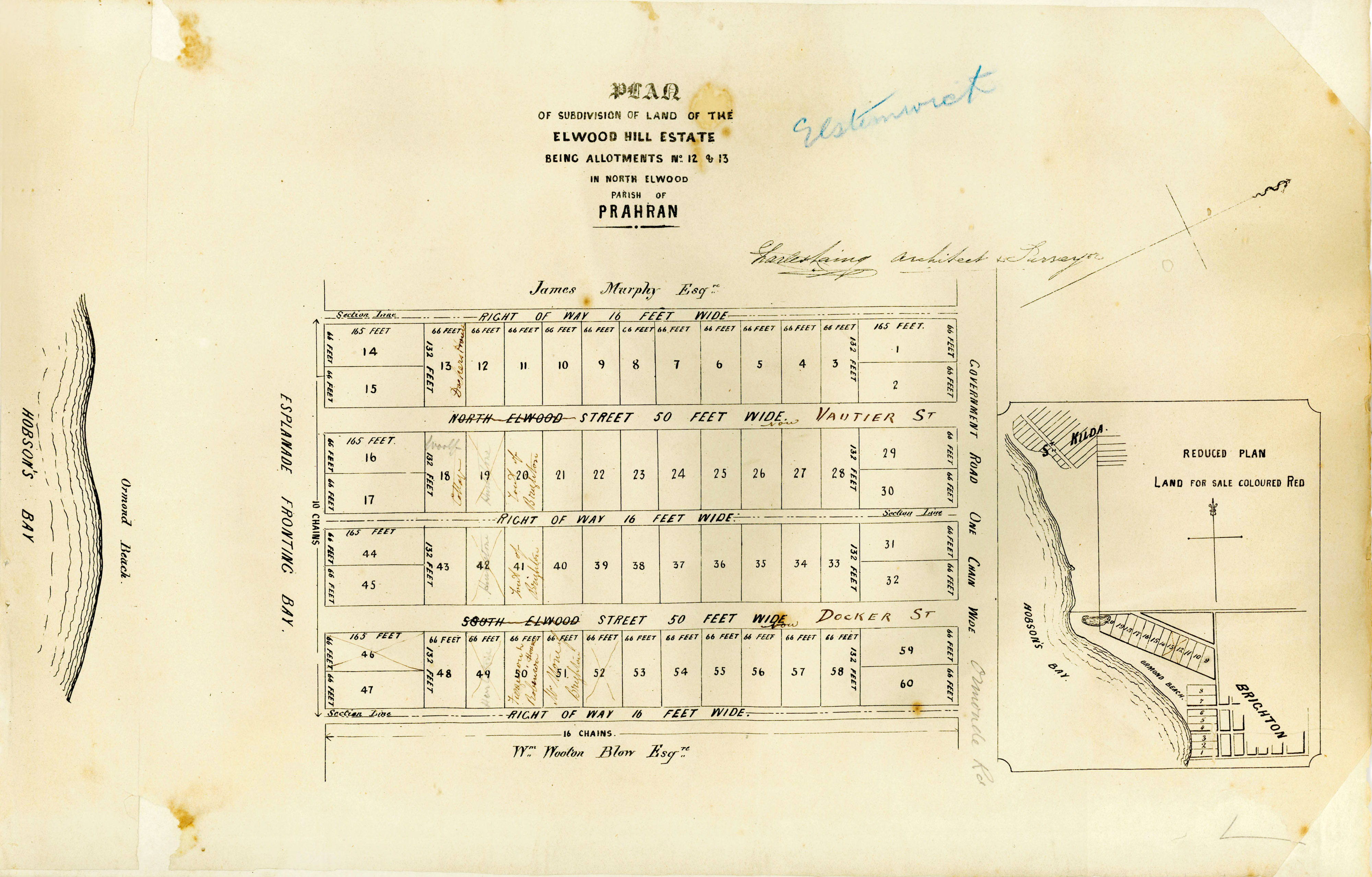 As an investment in 1853, Docker bought eleven allotments of land in North Elwood (now Elwood), from the Crown Grantee J.G. Vautier within the Elwood Hill Estate, which was a subdivision of Crown Allotments 12 and 13, now bounded by Beach Avenue, Ormond Road, and South Elwood (now Docker) Street and Ormond Road, facing the St Kilda to Brighton Track (now the bike track) and Ormond (now Elwood) Beach.