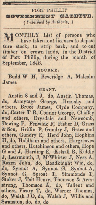 This Government notice appeared in The Argus newspaper, announcing that Anne Drysdale and Caroline Newcombe were amongst the many people that were issued with licences to exploit crown lands in the county of Grant.