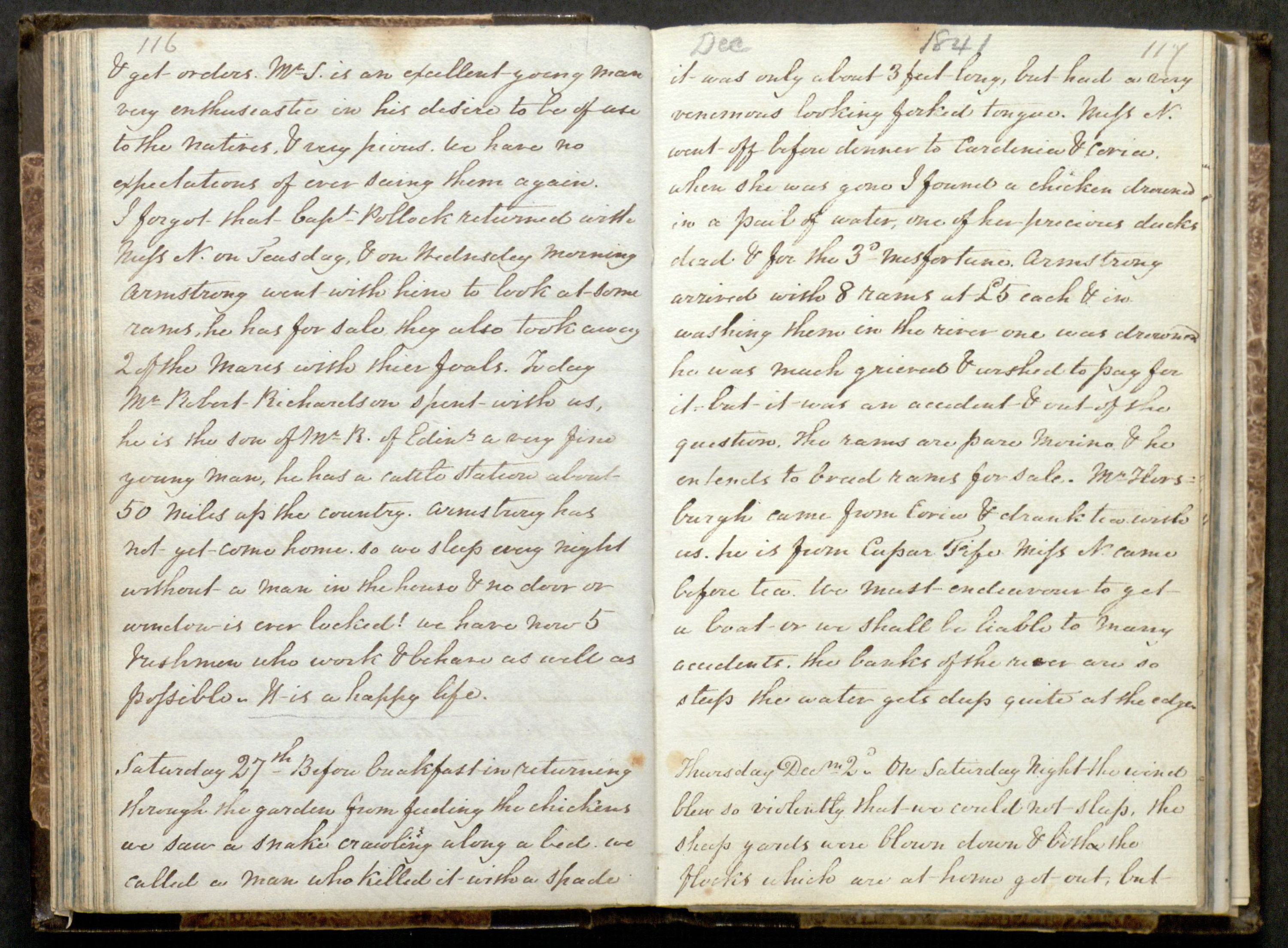 Saturday 27th [November 1841] Before breakfast in returning through the garden from feeding the chickens we saw a snake crawling along a bed. We called a man who killed it with a spade. It was only about 3 feet long but had a very venemous looking forked tongue. Miss N went off before dinner to Cardinia & Corio. When she was gone I found a chicken drowned in a pail of water, one of her precious ducks dead & for the 3rd misfortune, Armstrong arrived with 7 rams at ?5 each & in washing them in the river, one was drowned. He was much grieved & wished to pay for it but it was an accident & out of the question. The rams are pure merino and he intends to breed rams for sale. Mr Horsburgh came from Corio & drank tea with us, he is from Cupar, Fife. Miss N came before tea. We must endeavour to get a boat or we shall be liable to many accidents, the banks of the river are so steep the water gets deep quite at the edge.