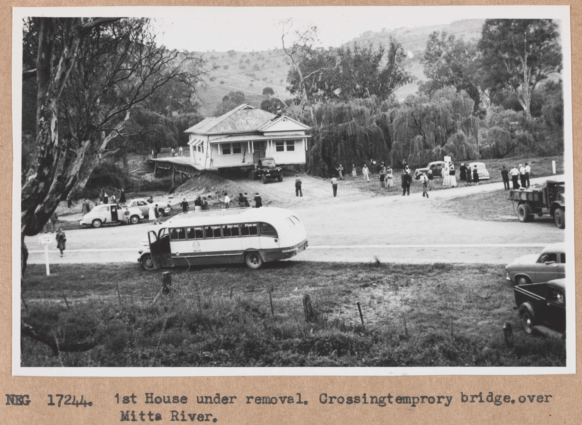 A crowd gathered to watch as the first house to be moved from old Tallangatta, was carefully maneuvered over a purpose built bridge across the Mitta River. It arrived safely at the new site at Bolga, 6 kilometres away.