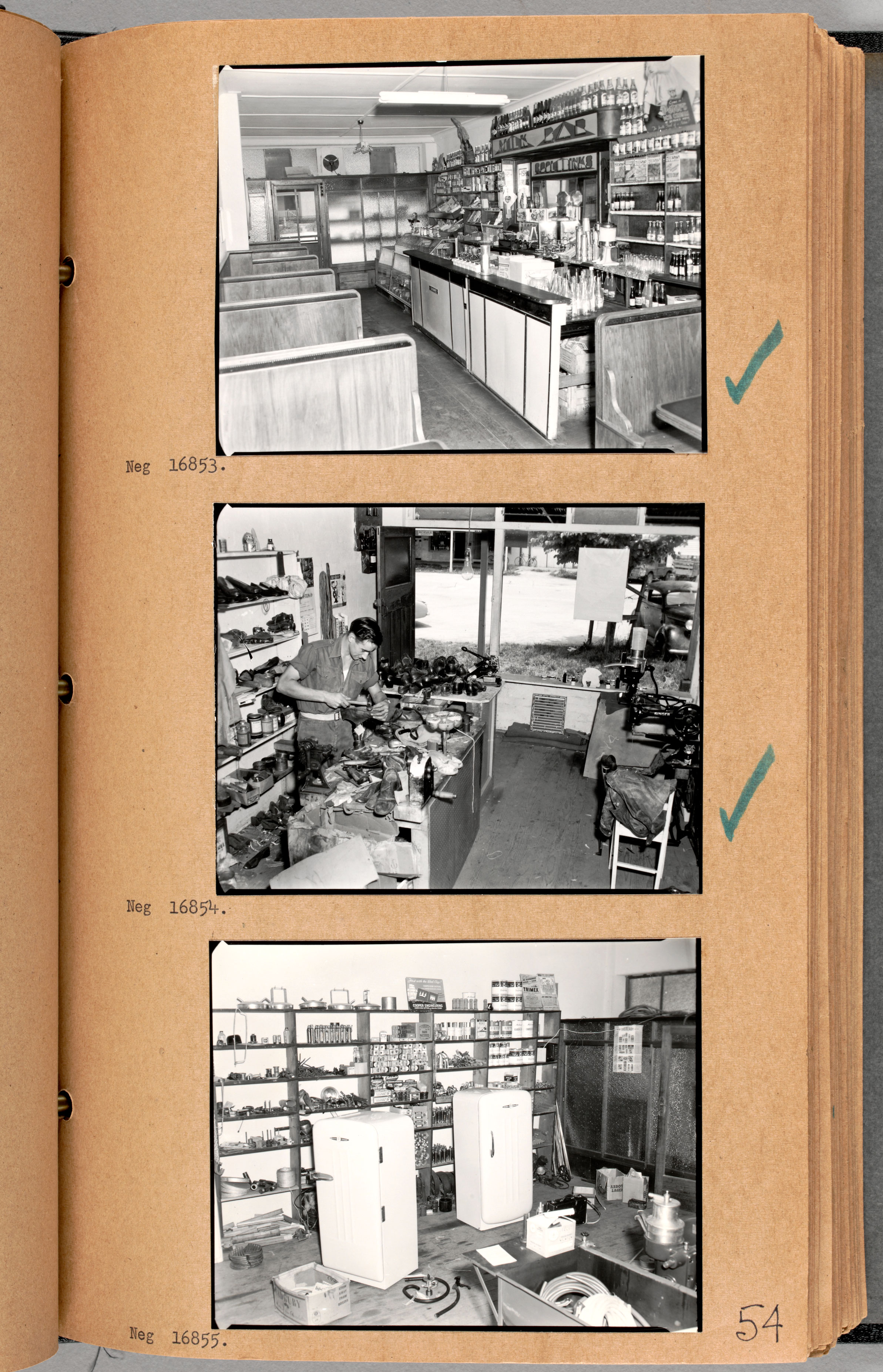 The State Rivers and Water Supply Commission were given the responsibility of moving the town of Tallangatta to its new location. They documented the process and later deposited their photographic archive, as a long term loan, with the State Library of Victoria. This is a page from an album which visually records the streets, the architecture and many of the interiors of private houses and local businesses. This page shows the Hume cafe, Farrant bootmakers and Kendall's machinery agent.