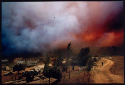 This photograph vividly communicates the ferocity of the Australia Day fires of 2003, which raged through north east Victoria and into Canberra.   Omeo is under a pall of dense smoke, the hot wind whips through the trees, and there is a menacing orange glow of the approaching fire in the background.  The scale of this event is evident as a resident runs from his property and flames begin to move over the top of the town.