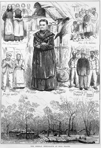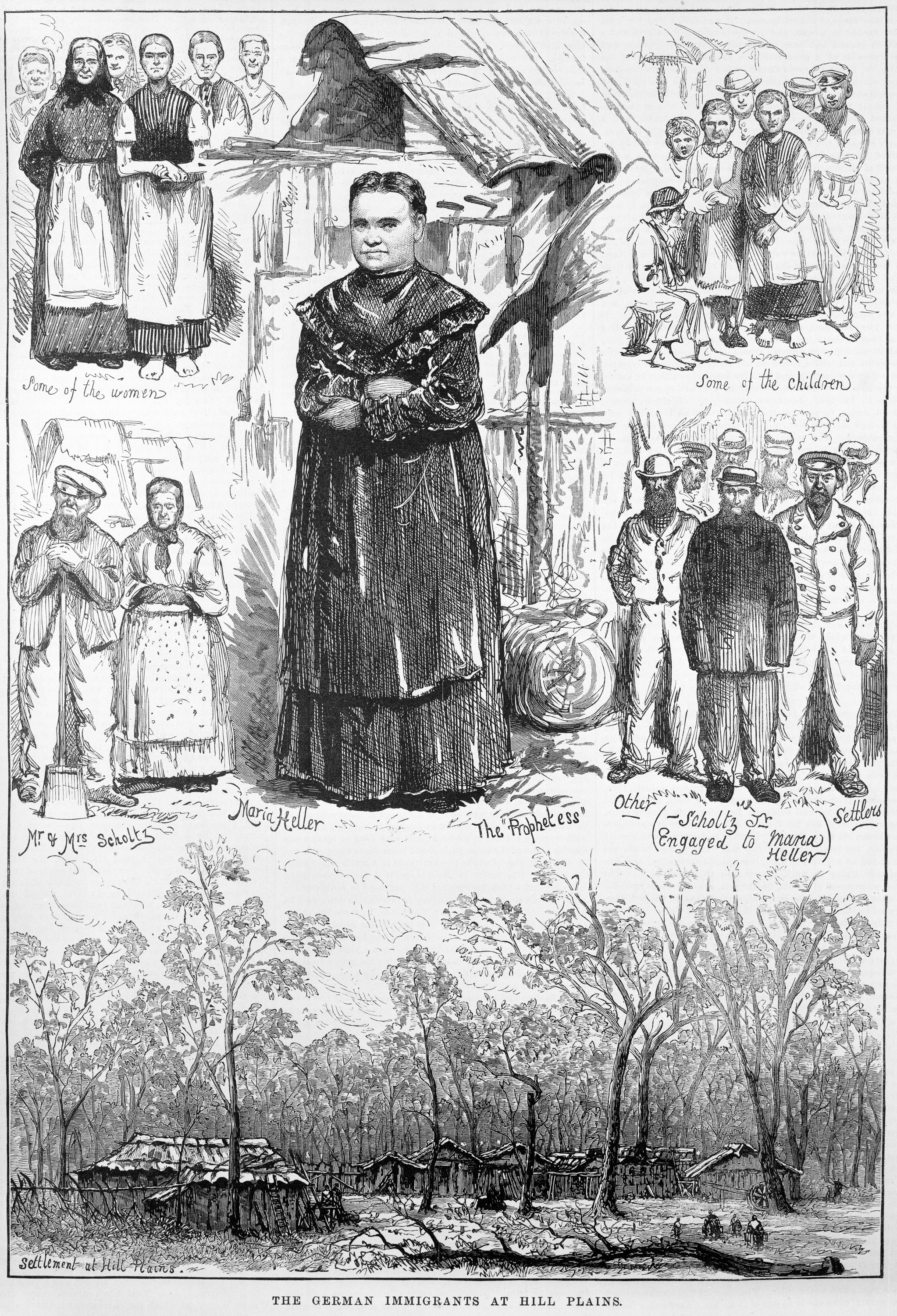 The story of the pitiful German immigrants at Hill Plains was sensationalised by reporters. The interest that it sparked inspired the illustrated newspapers to send artists to the commune to sketch the settlement, the prophetess Maria, and her starving group of alleged 'fanatics'. Published in the Australasian Sketcher 27 December 1875