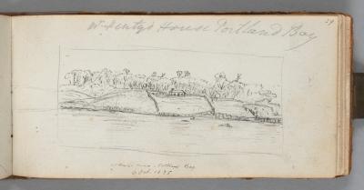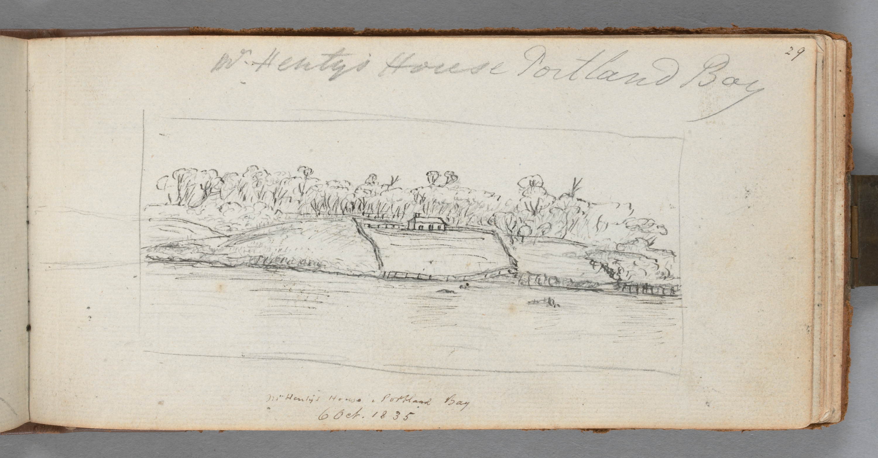 Whilst sailing the Victorian coastline, John Helder Wedge, a member of the Port Phillip Association, and former Assistant Surveyor General of Van Diemen's Land, entered Portland Bay. His sketchbook records some of the development he saw in the area, including the original hut constructed by Mr Henty with materials brought across from Launceston on the Thistle. After the town was finally surveyed in 1840, Mr Henty's house was swept away to make room for Bentinck Street.