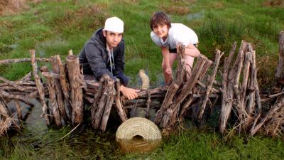 Tyson Lovett-Murray and Sean Bell from the Gunditjmara people place a traditionally woven kooyang (short finned eel) basket in a wooden frame to catch kooyang at the Tyrendarra Indigenous Protected Area.