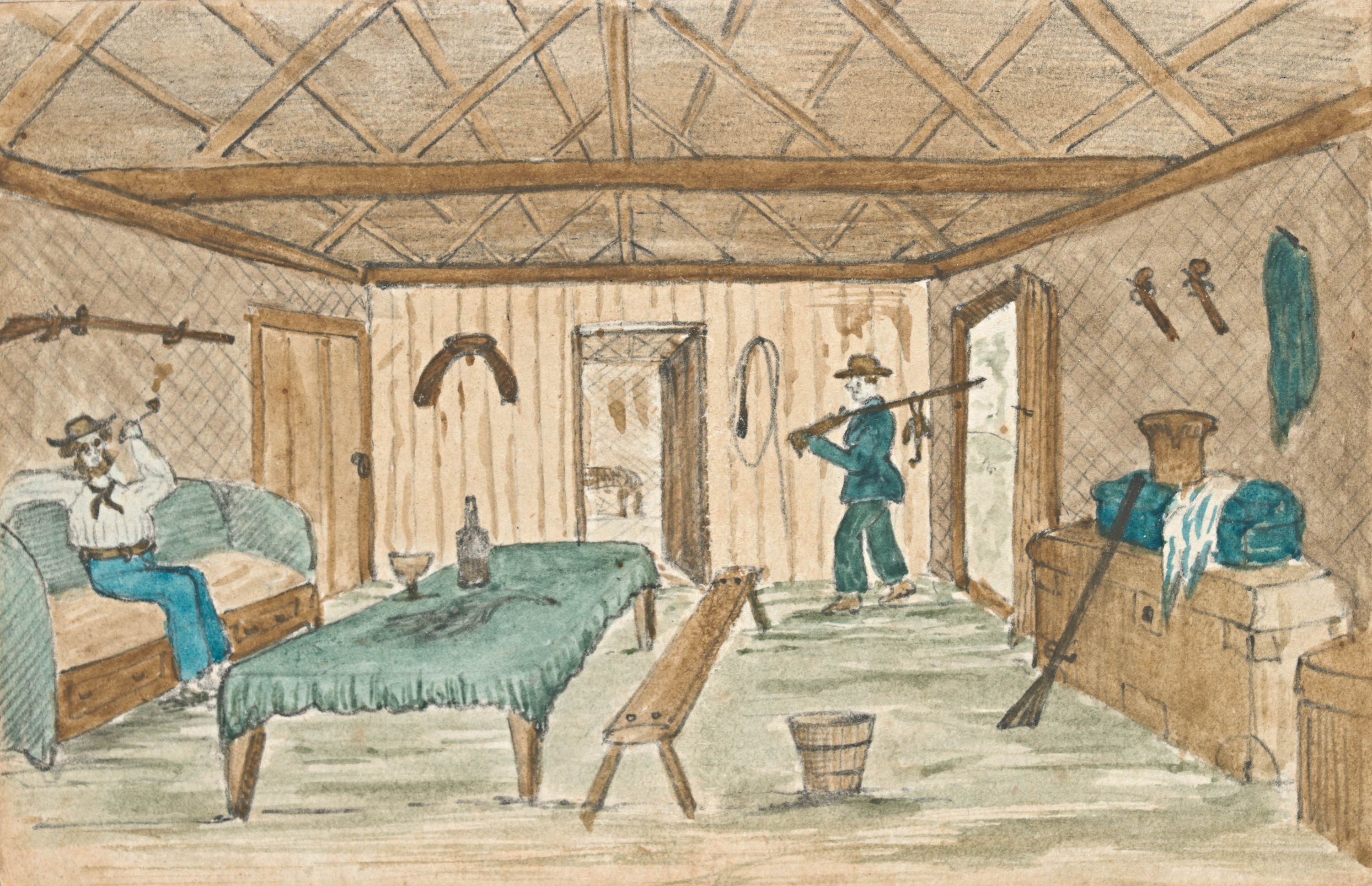 This charming, childlike painting reveals the interior of Mr Edward Birch's hut on the 6000 acre, Seven Hills Estate near Creswick. It shows the basic, but comfortable environment that some pastoral pioneers were able to create for themselves.