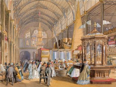 Australia's display at this exhibition in London concentrates on its production of gold. The tall pyramid represents the total volume of gold extracted to that date in Victoria. Note the men at the wooden puddling tub, demonstrating the technique of panning for gold.