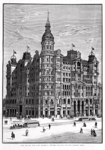 This spectacular hotel expressed the wealth and confidence of the city during its boom years.  The name 'coffee palace' was used to indicate that the hotel did not serve alcohol, as there were many in Victoria who belonged to anti-alcohol 'temperance societies'.  The Federal Coffee Palace survived until 1972, when it was demolished to make way for an office building.