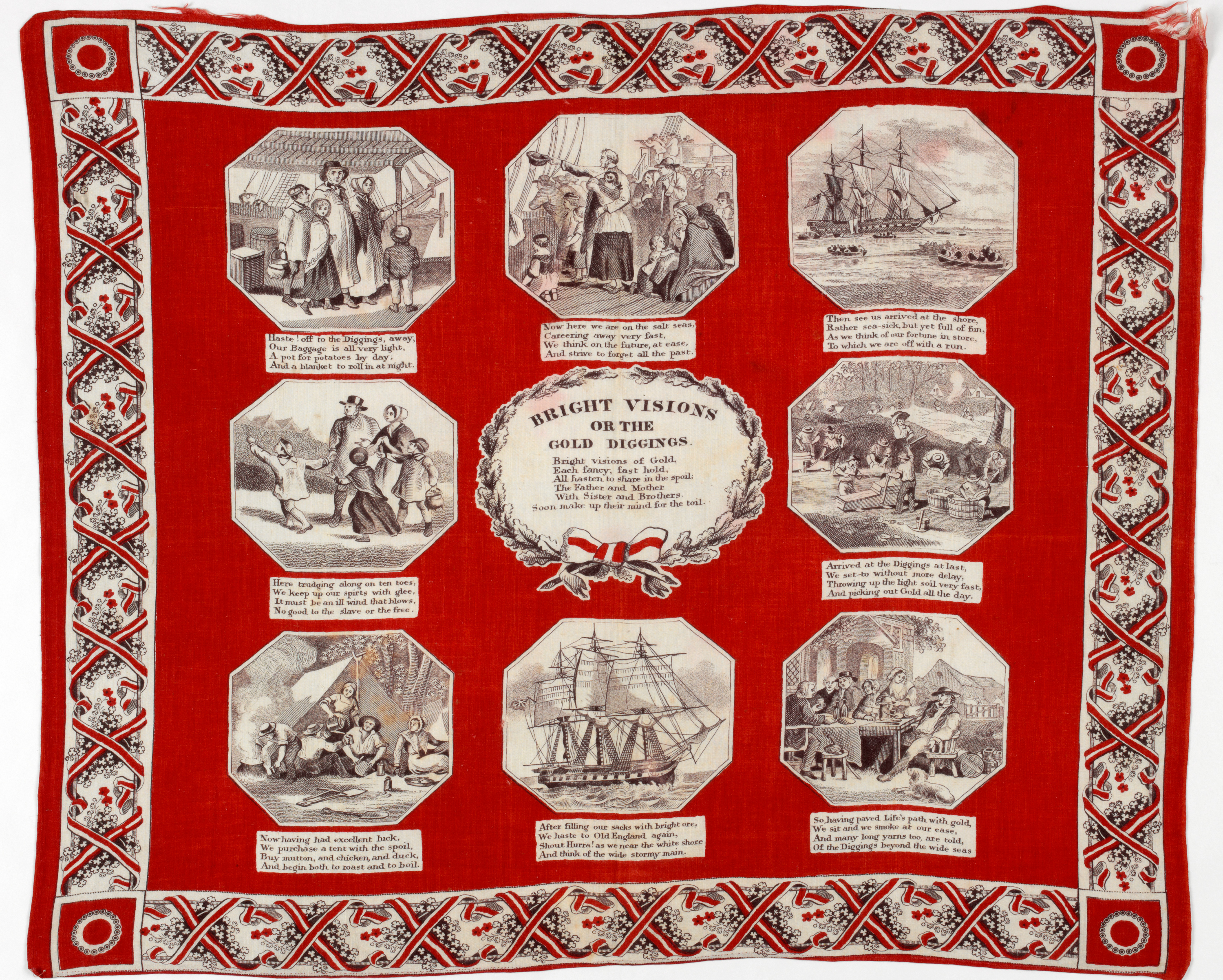 Kerchief, printed in sepia and red on white cotton, with eight illustrations accompanied by rhyming verses extolling the good fortune awaiting a gold seeking family brave enough to set sail for the Port Phillip district. In fact, few emigrants returned to England having made their fortune like the family shown here. Also, the goldfields were almost entirely populated by single men: family groups like this were rare.
