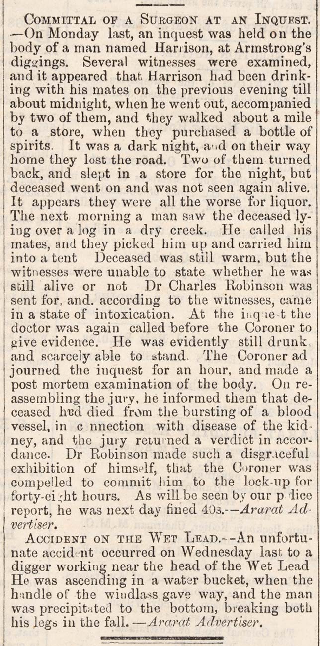 Conditions on the goldfields were dangerous, and the propensity for heavy drinking resulted in frequent accidents, fights and health problems. This newspaper article reveals that those in need of medical attention could not always rely on professional service from a doctor, if, indeed, they were lucky enough to locate one.