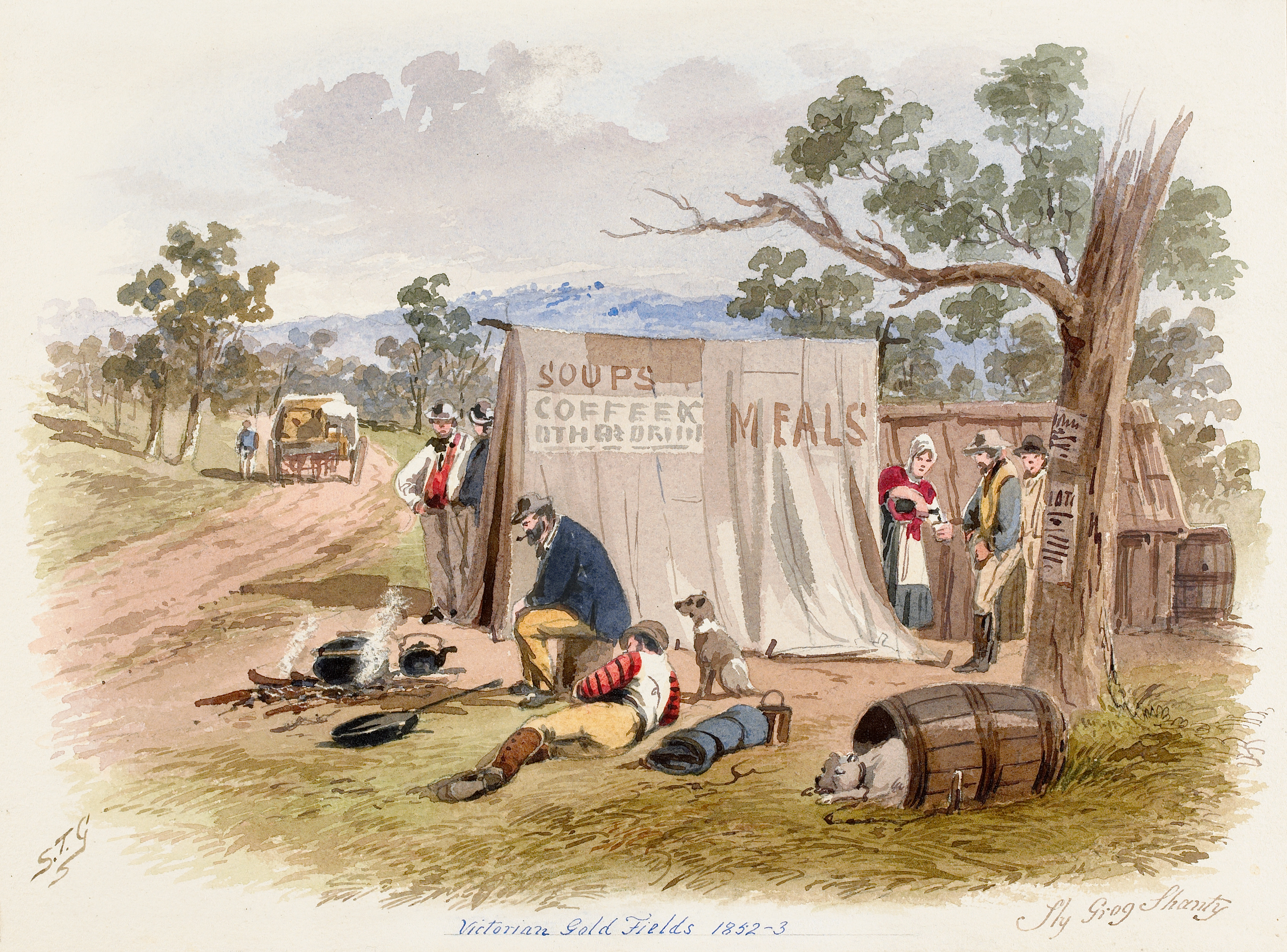 Liquor laws prevented the legal sale of alcohol on the goldfields but many enterprising folk satisfied the demand for drink by selling 'sly grog' from outlets, such as this respectable looking meals and soup tent.