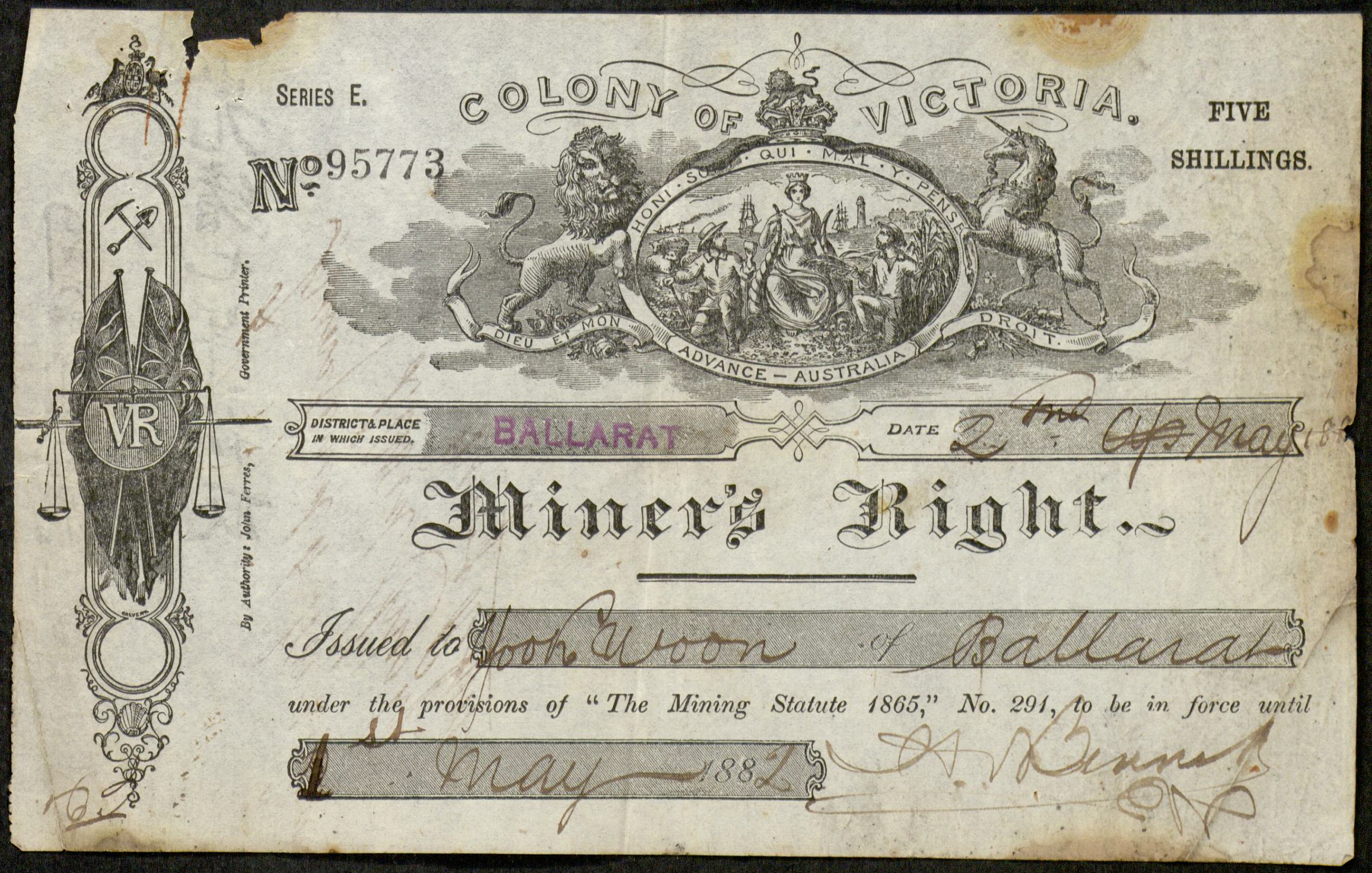 After the Eureka Stockade, and the Report from the commission into the state of the goldfields, the miners licence was replaced with a miner's right.  It could be purchased at the very affordable, annual cost of £1 per annum.  The cost fluctuated over the years. In 1881, Yooh Woon, a Chinese miner at Ballarat, purchased this right at a cost of 5 shillings.